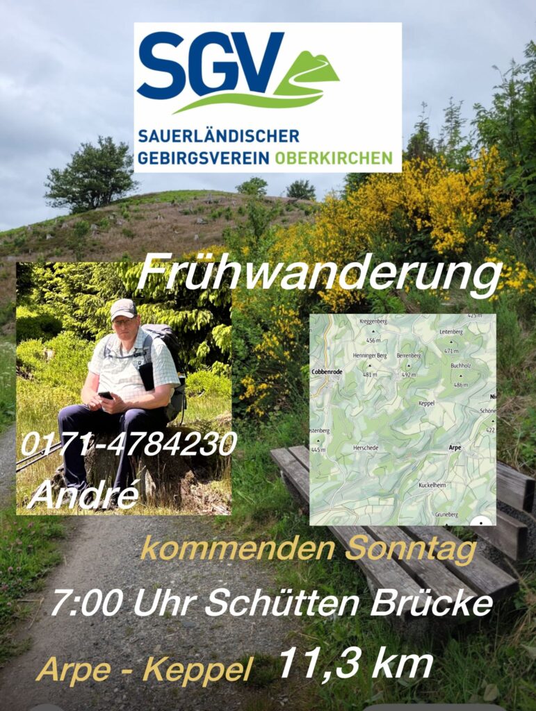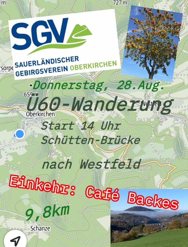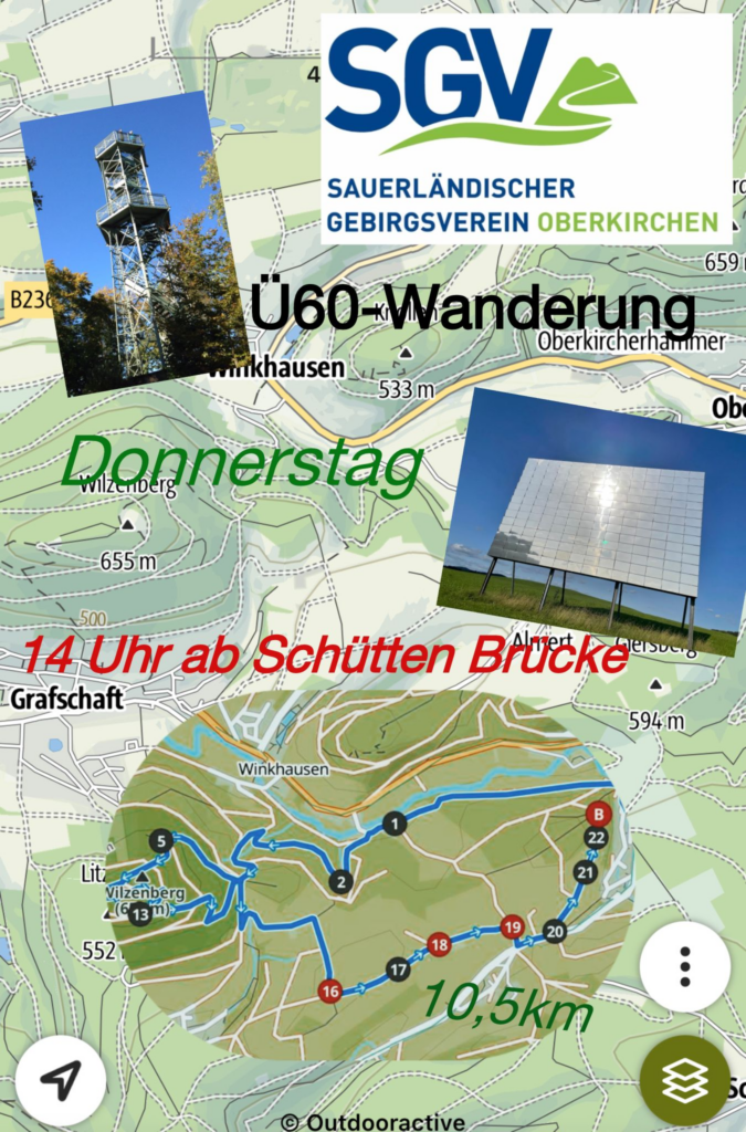 Am Donnerstag, 18.09.25 findet unsere nächste Ü60 Wanderung statt. Wir treffen uns um 14.00 Uhr an Schütten Brücke. Die Wanderung führt uns von Oberkirchen über Winkhausen auf den Wilzenberg. Zurück wandern wir am „Blinker“ vorbei nach Oberkirchen.