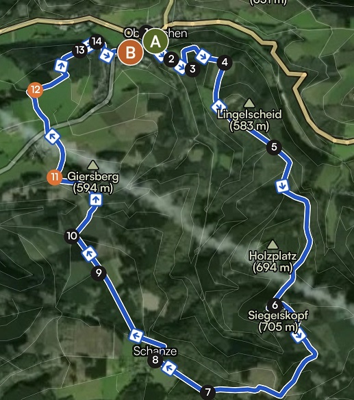 Bis dahin haben wir schon ca.12 km hinter uns gebracht. Der Rückweg erfolgt auf verschiedenen Pfaden über Westfeld zurück nach Oberkirchen. Es kann zwischen den Längen 16 und 21 km gewählt werden.